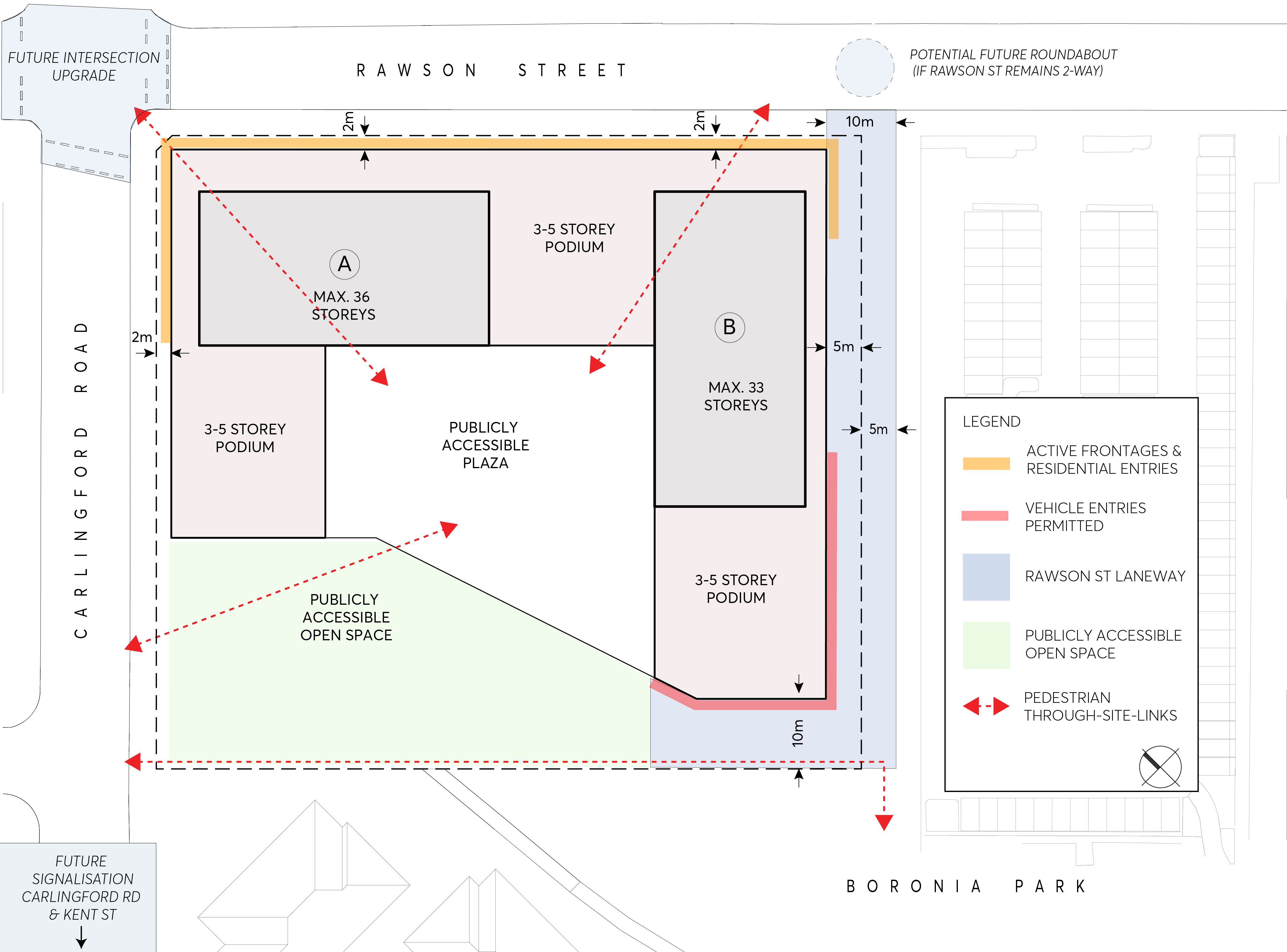 The building height controls are proposed to be a maximum of 122m (36 storeys) and 112m (33 storeys) on parts of the site. This would facilitate a future two tower development of 36 and 33 storeys (inclusive of a 3-5 storey podium).