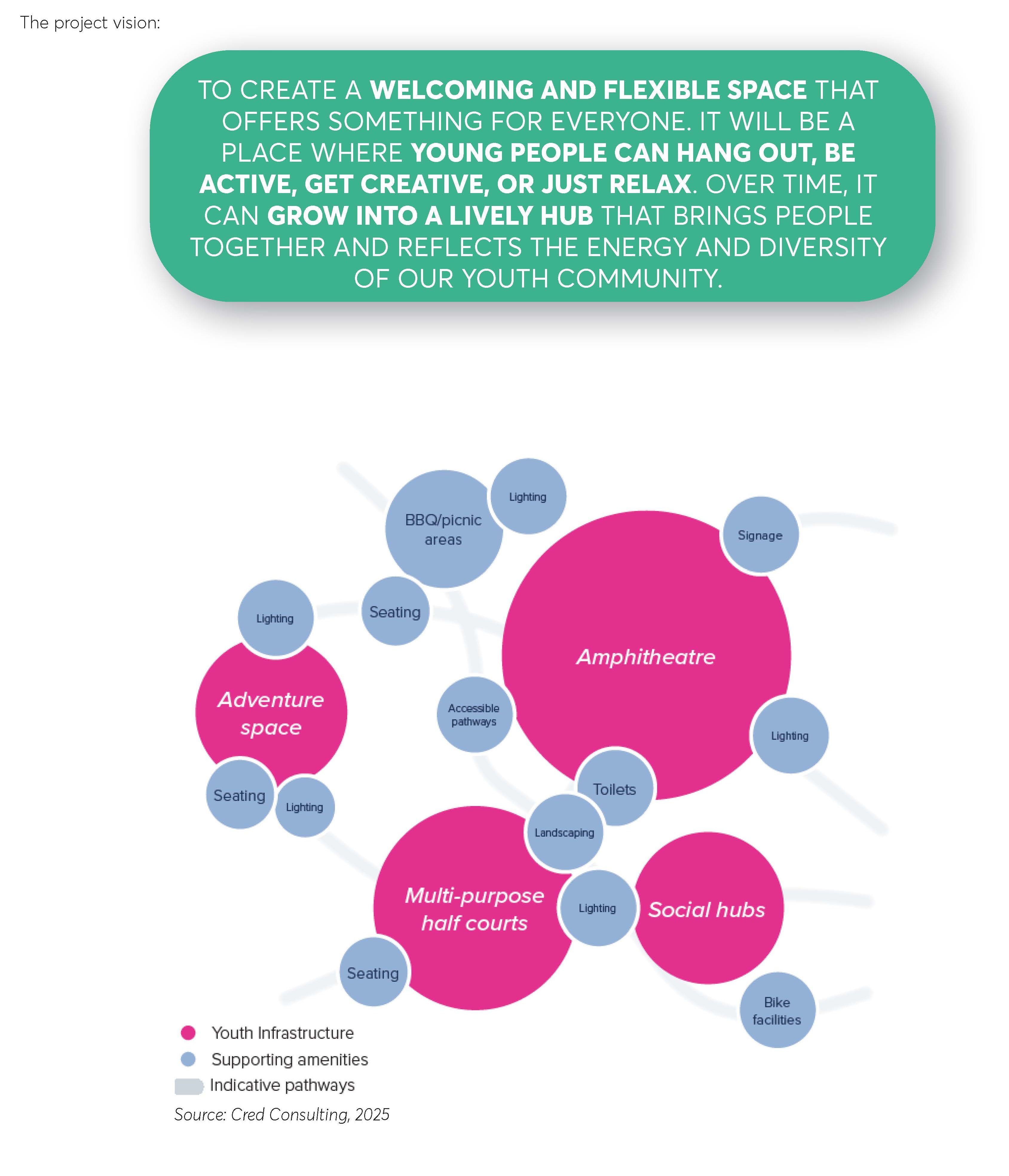 Guided by youth input, the features shown in the project vision illustrate a community-driven design that supports connection, creativity, and enjoyment for people of all ages.