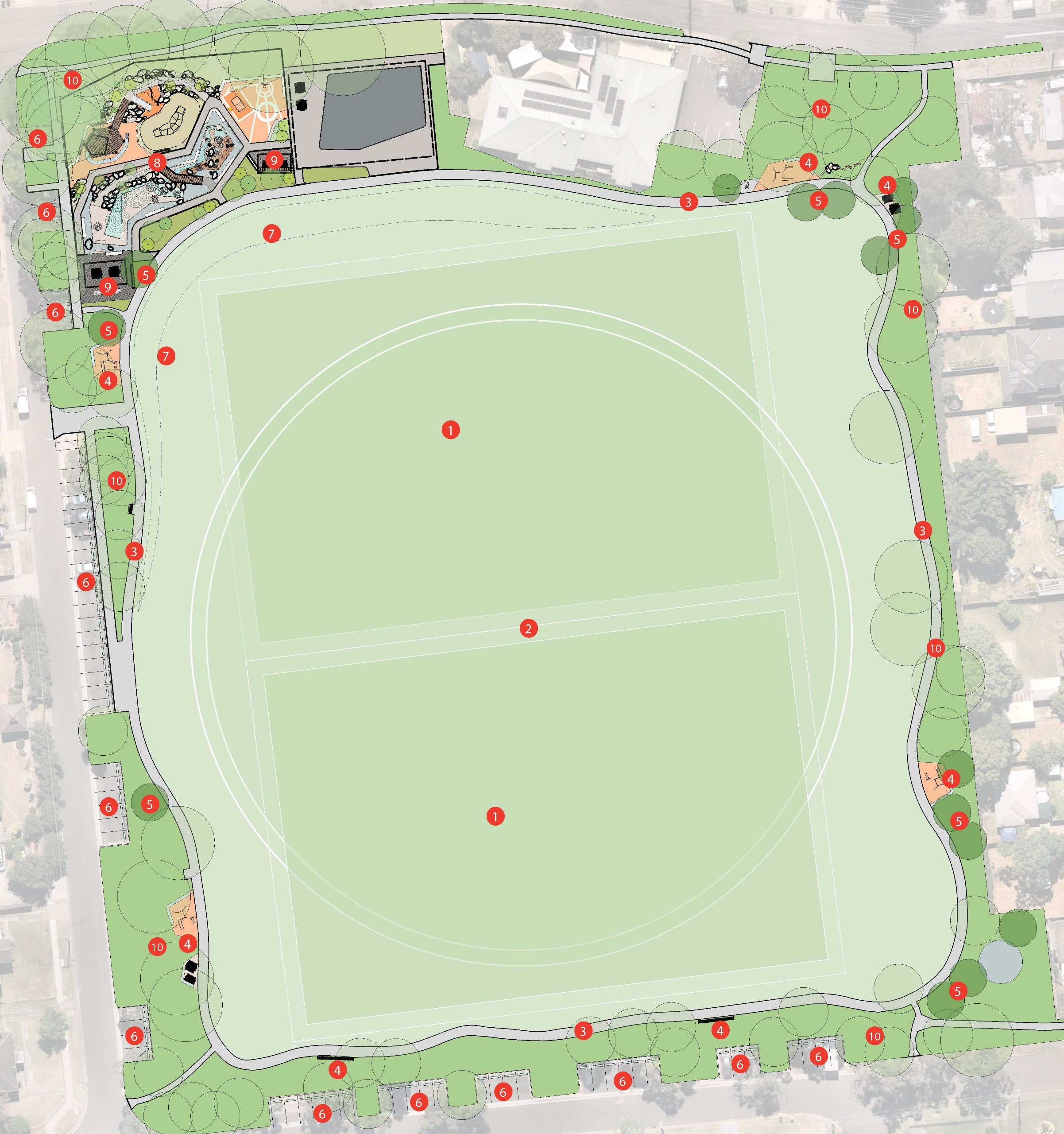 Other features of the park include public toilets, outdoor exercise equipment, circuit track, drinking fountains, one third basketball court, picnic areas and barbecues and amenities building with change rooms and a small kiosk. There is also a Council-owned Childcare and parking spaces on-site.