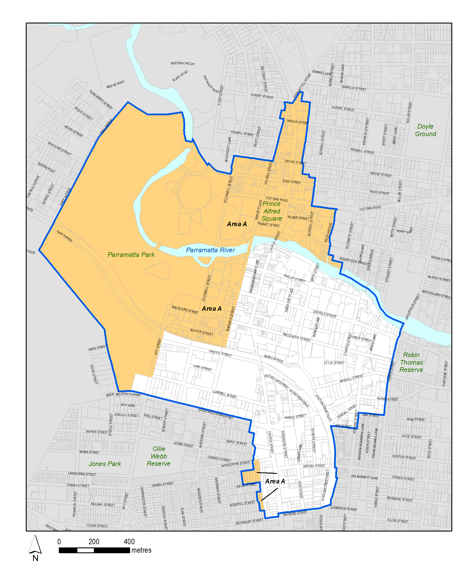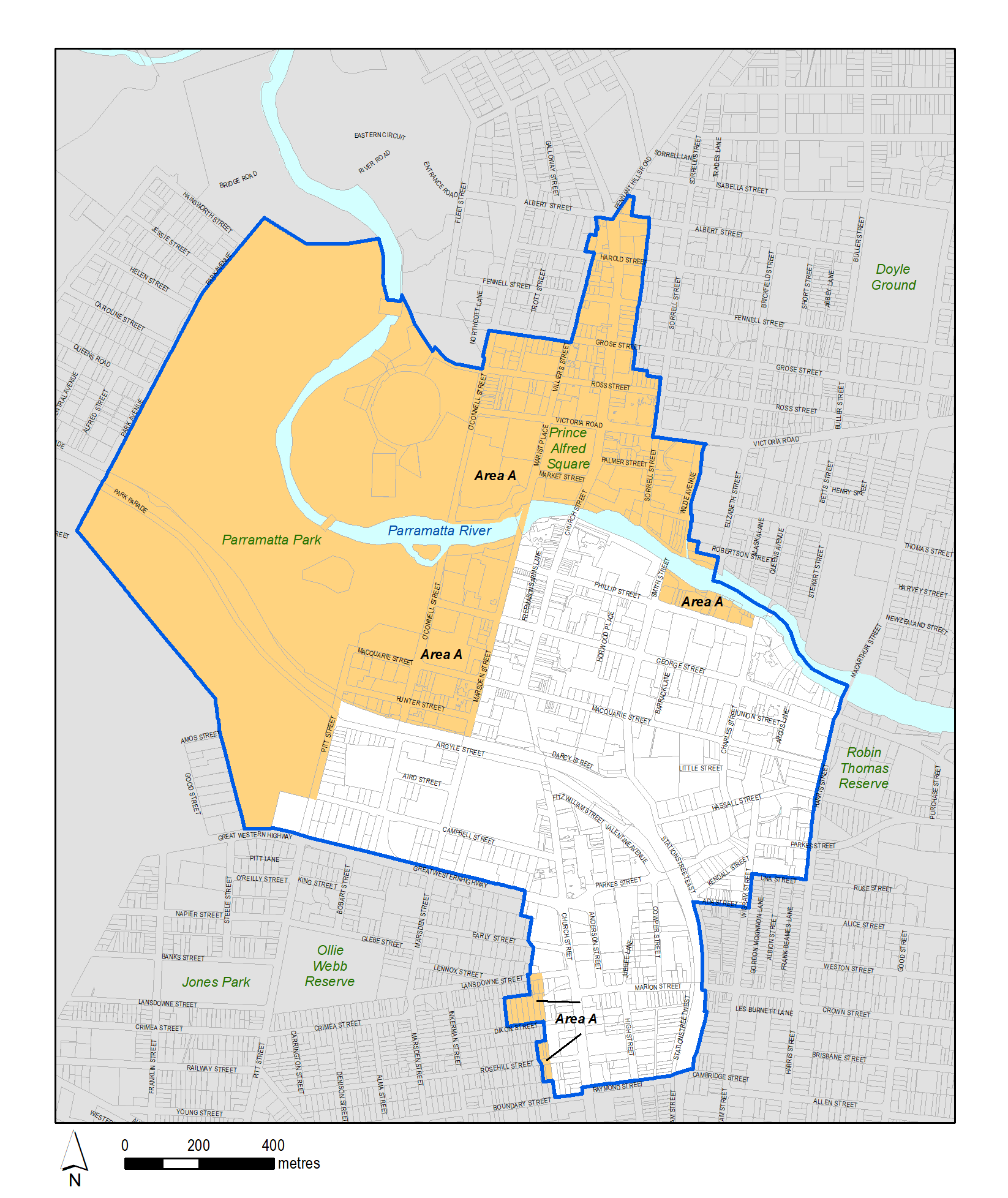 The amended Contributions Plan applies the higher percentage rates (4% and 5%) to the Phillip Street Block – being land bounded by Phillip Street, Smith Street, the Parramatta River, and Charles Street (outlined in red in the image above) – by removing the “Area A” notation from that land.