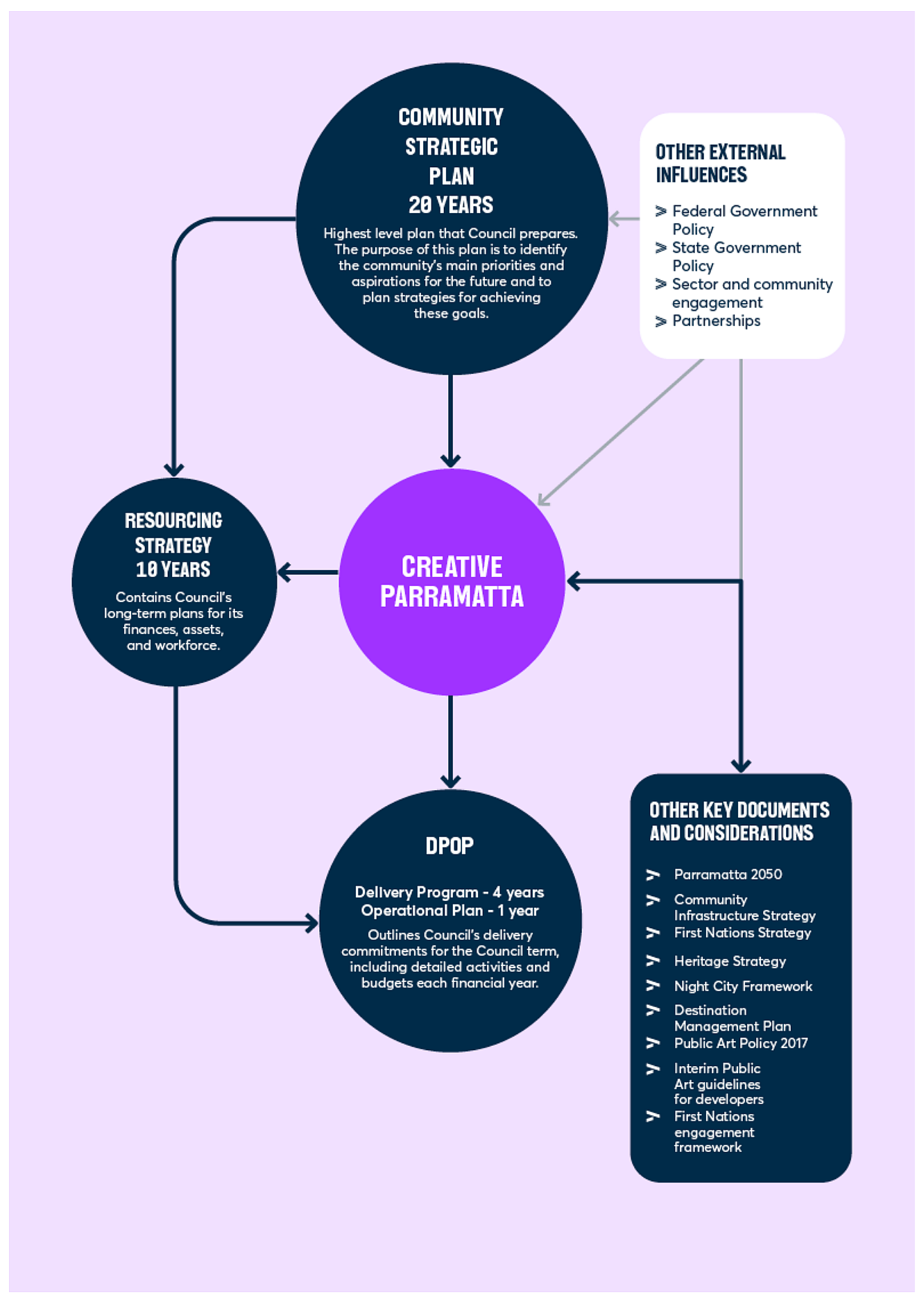 It is the City of Parramatta’s 10-year cultural strategy, providing a cohesive vision for arts, cultural and creative practice and participation in our City. The purpose of this strategy is to: