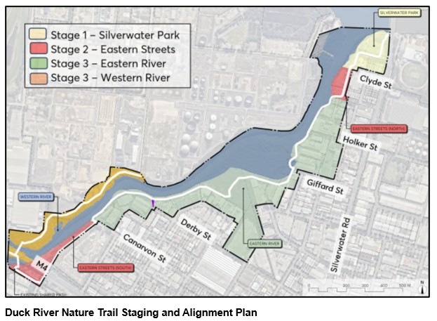 The vision for Duck River Nature Trail is to unlock the significant areas of high-value ecological communities that are currently hidden from view and allow the community to safely experience walking and cycling along the foreshore. The project will undergo rigorous planning processes including the preparation of an Environmental Impact Statement and for Silverwater Park a Review of Environmental Factors.