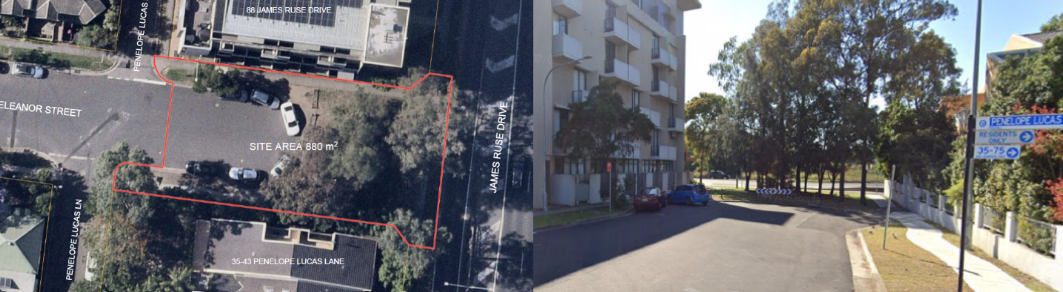 Currently, the space is a cul-de-sac with a turning circle and six on-street parking spaces, along with a small landscaped area to prevent vehicle access to James Ruse Drive. The area between the cul-de-sac and James Ruse Drive is planted with native trees including Eucalypts, Casuarinas and Bottlebrush ranging from 8 to 20 metres tall.