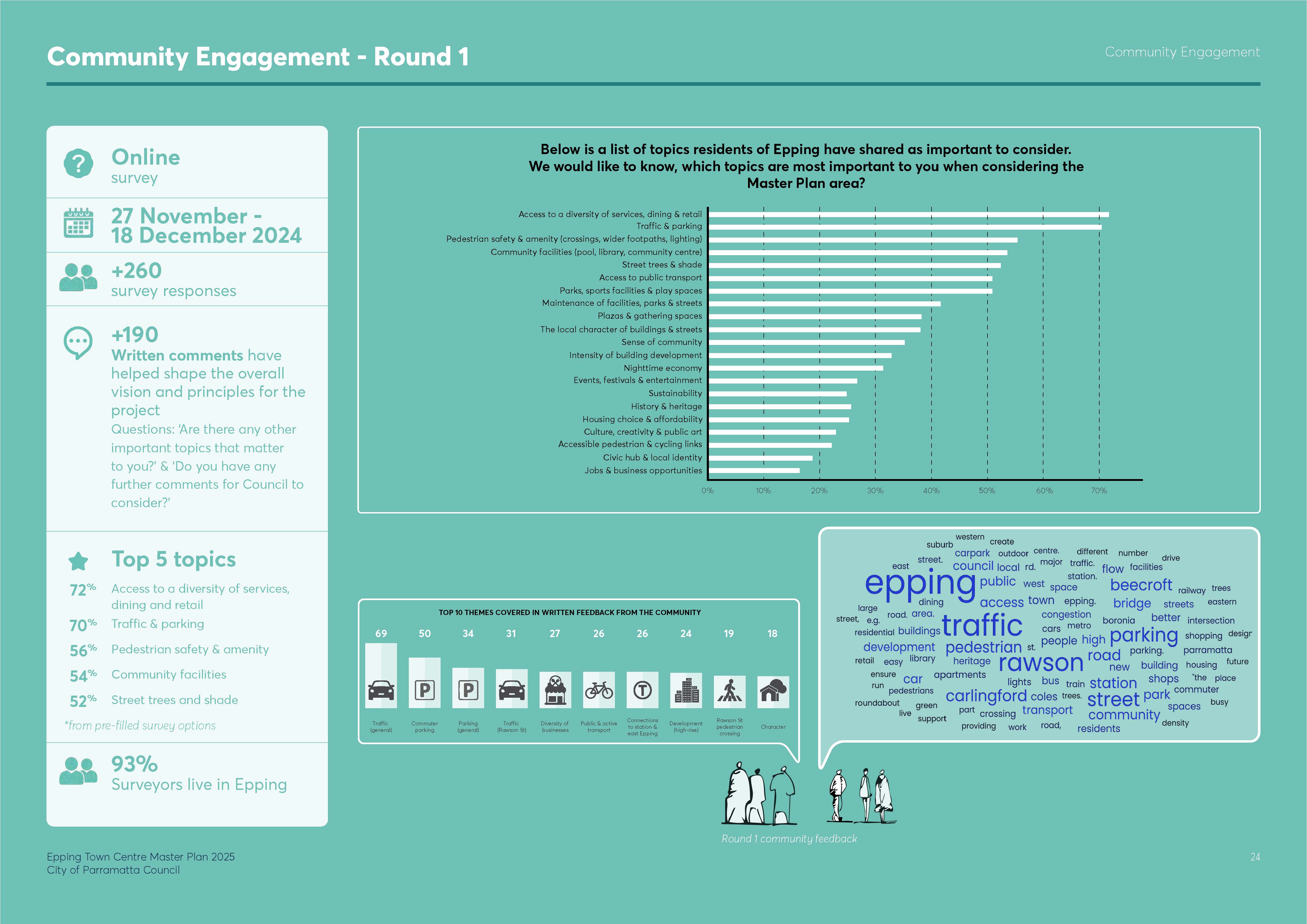 The Epping Town Centre Master Plan was publicly exhibited from Wednesday 16 July to Monday 18 August 2025. The public exhibition was promoted with 4,800 notification letters to nearby property owners; a media release; social media ads; promotion in Council’s e-newsletters; and updates to previously engaged members of the community.