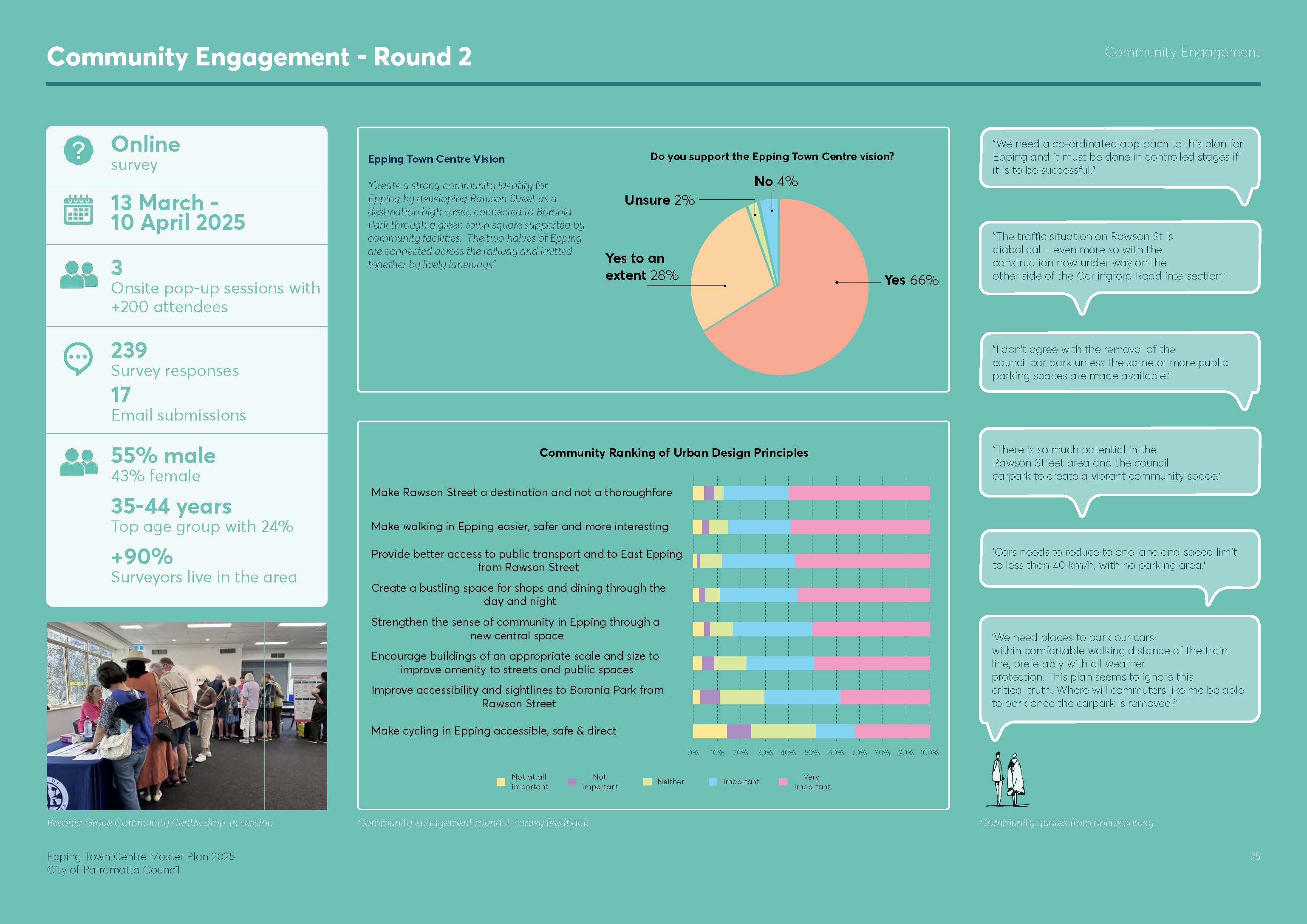 Positive responses indicated strong support for the overarching principles and vision of the Master Plan including enhanced laneway and pedestrian connections, notably the proposed link to Epping Railway station, traffic improvement initiatives under consideration, strengthened access to Boronia Park, provision of basement car parking, and the creation of a community hub and civic square.