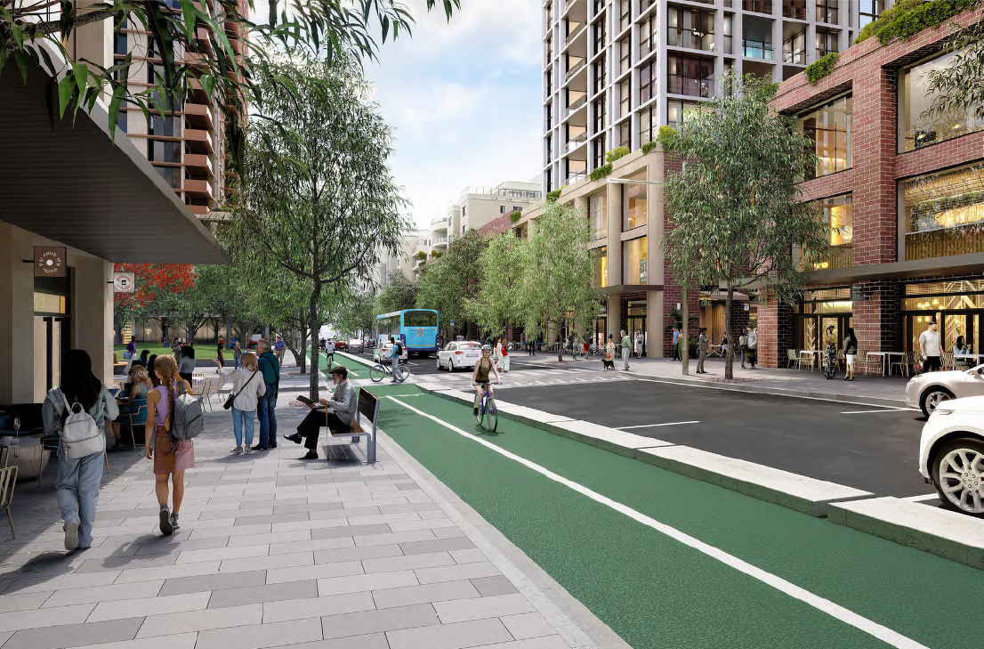 2). Rawson Street – a high street destination with cafés, restaurants and retail shops, prioritising pedestrian safety through widened footpaths, dedicated bike lanes, street tree planting and improving traffic conditions along Rawson Street.