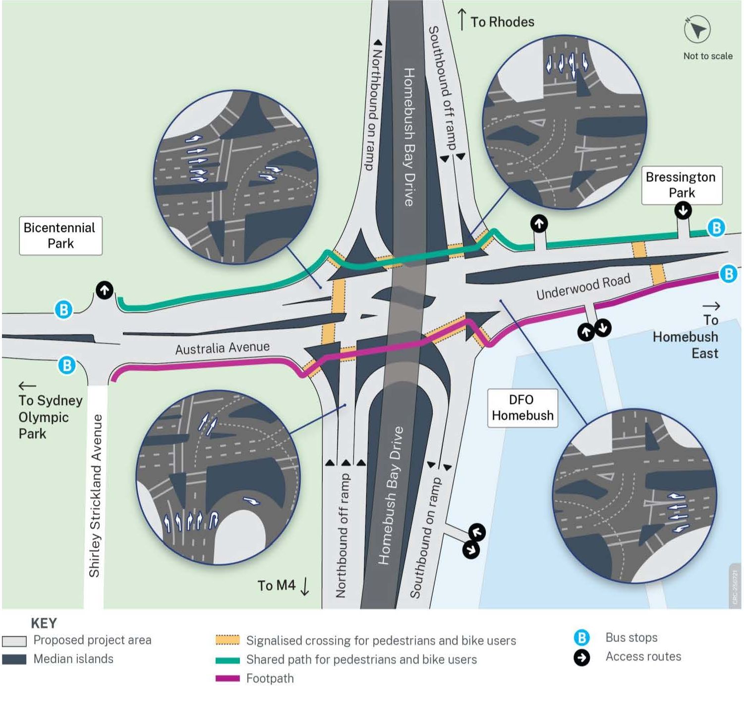 - Upgrading the existing pedestrian crossings at Homebush Bay Drive on/off ramps to shared walking and bike riding crossings
