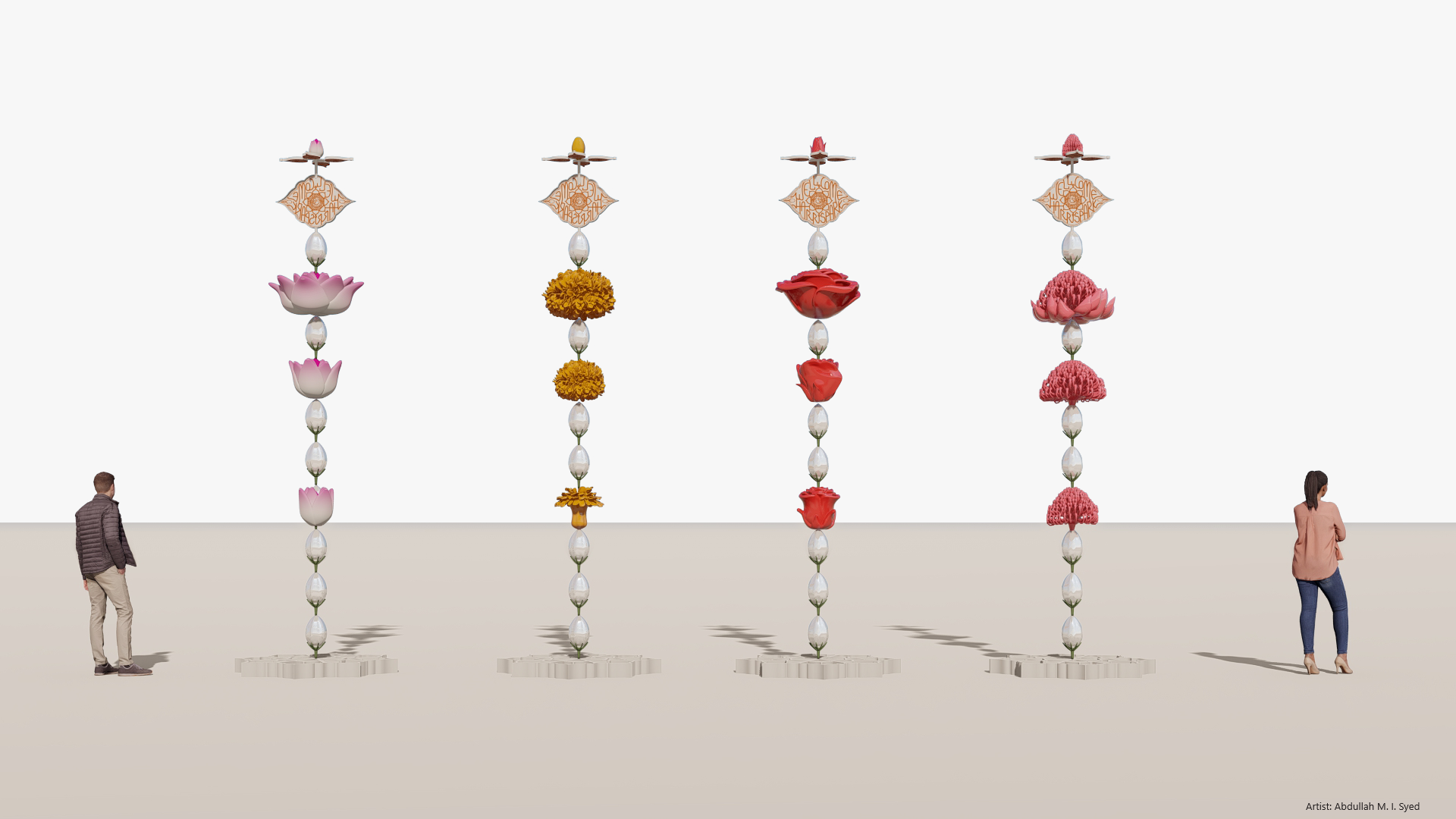 Garlands are symbols of purity, honour, beauty, peace, love, and passion. During special occasions, the frames of entranceways are decorated with garlands as a symbol of welcome. Flowers with significant meaning have been used in the design of the vertical sculptures including Marigolds (Gainda Phool); Roses (Gulab); Jasmine (Mogra); and Lotus, which hold significance across Indian cultures. Australia’s native Waratah flower will be integrated as a link to place, acknowledging and honouring history and heritage.
