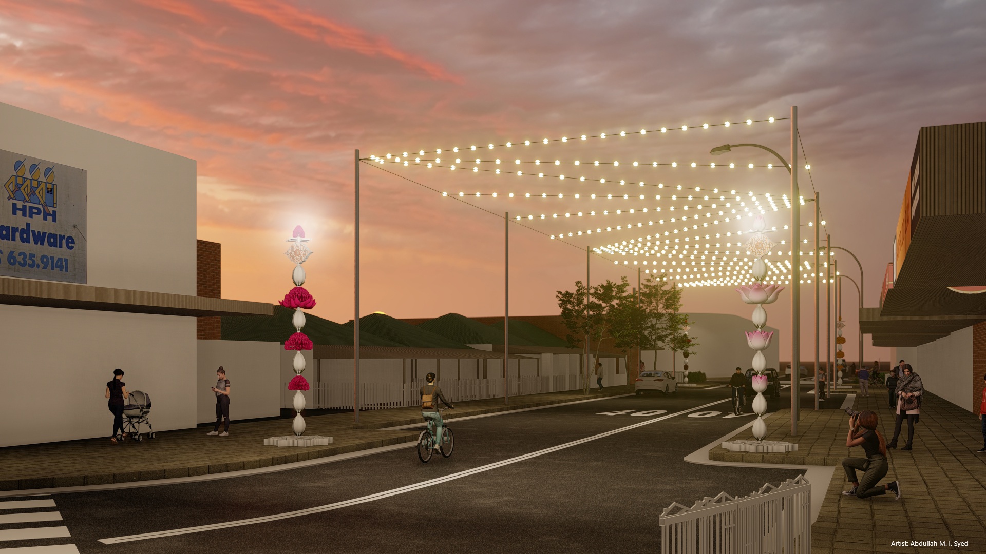 In Harris Park, these sculptures are proposed at each corner of the overhead decorative lighting, with the lighting itself representing space and light. The individual sculptures are inspired by flower garlands, traditionally used as a symbol of welcome.