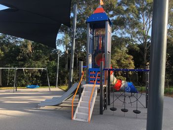 This option provides a variety of play experiences including a double slide, climbing nets, balancing elements, monkey bars and a triple swing. This option includes a triple swing with a basket swing.