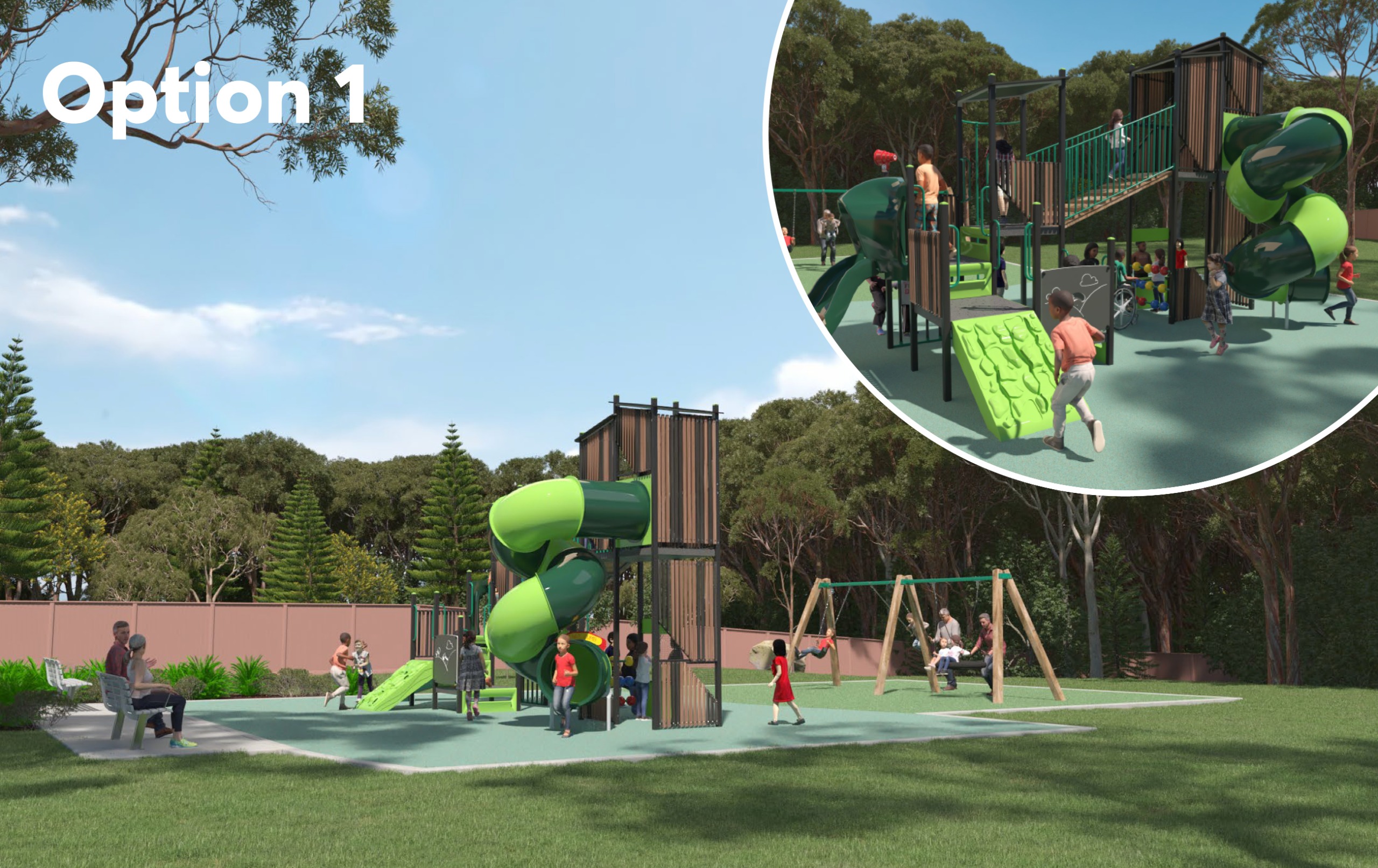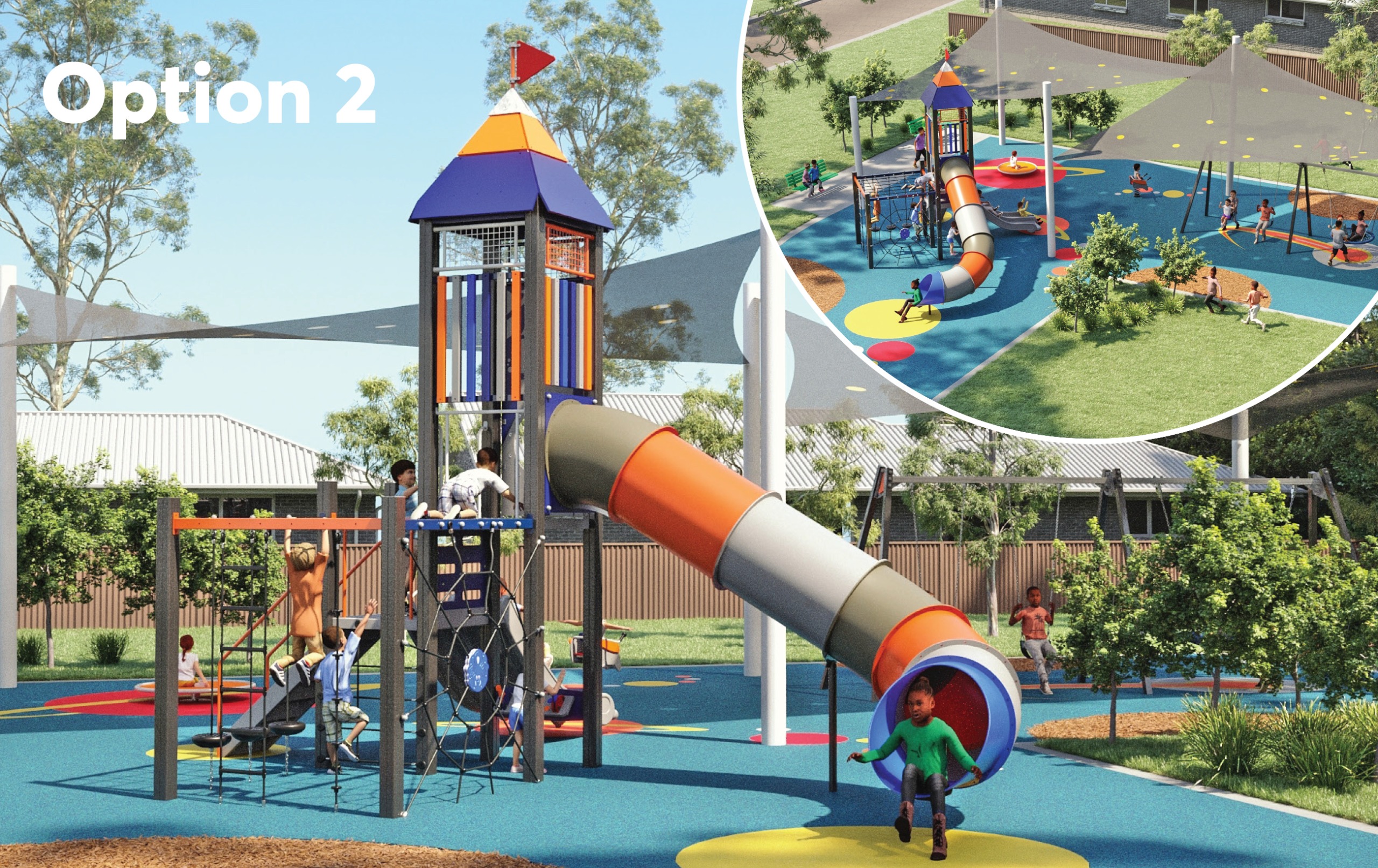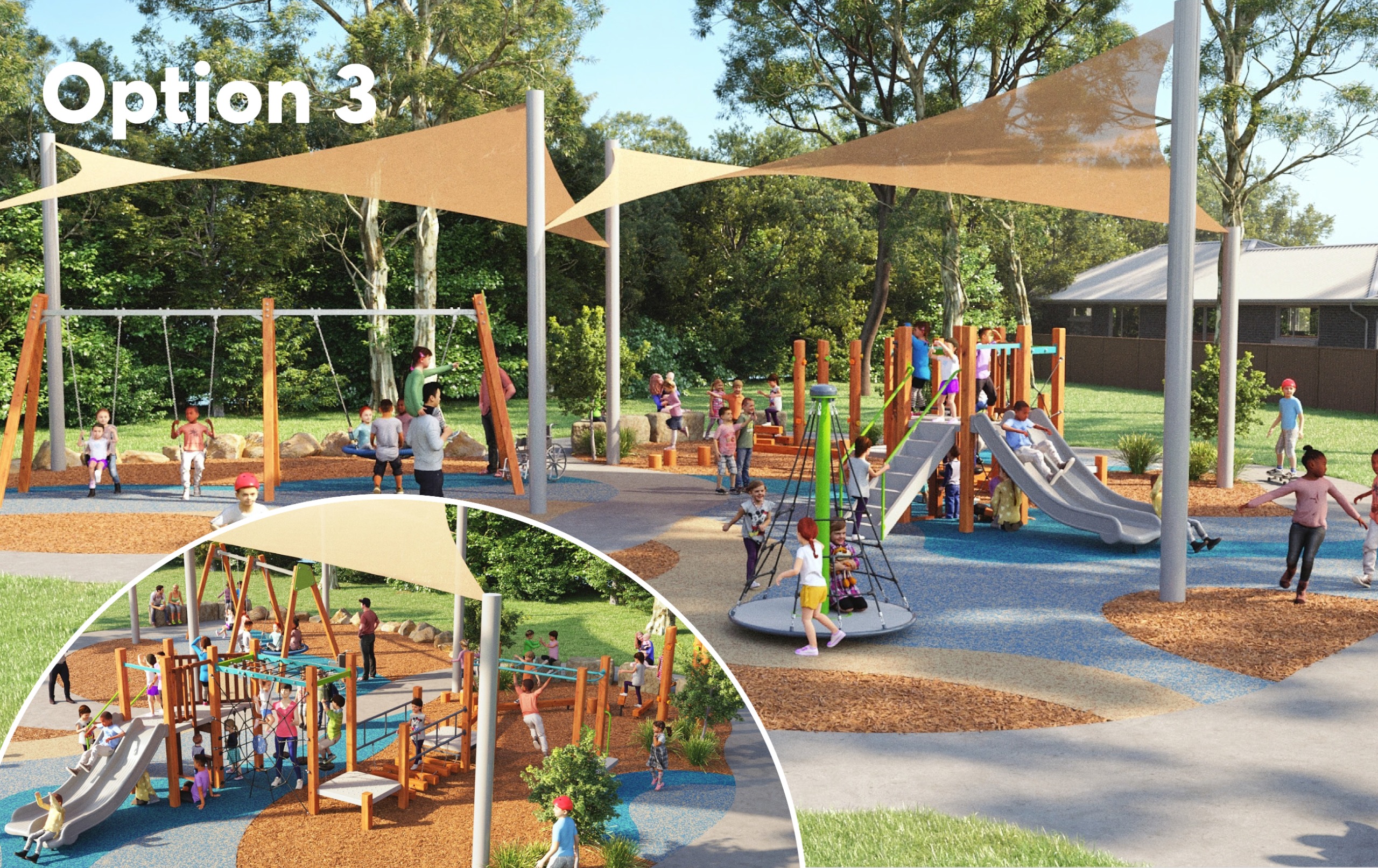 This option provides significant sliding, climbing and swing elements. The main play structure has three types of slides. There is a variety of climbing net options for all abilities. Climbing equipment was the most requested type of play. This option includes a triple swing with a basket swing.