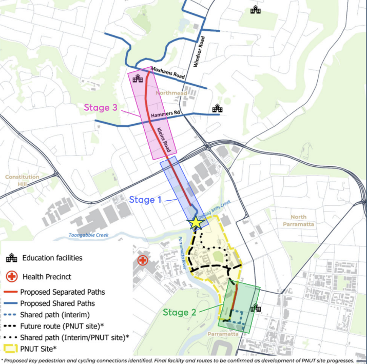 - Separated pedestrian and cyclist paths along the length of Kleins Rd, Northmead and part of Fleet St, North Parramatta.