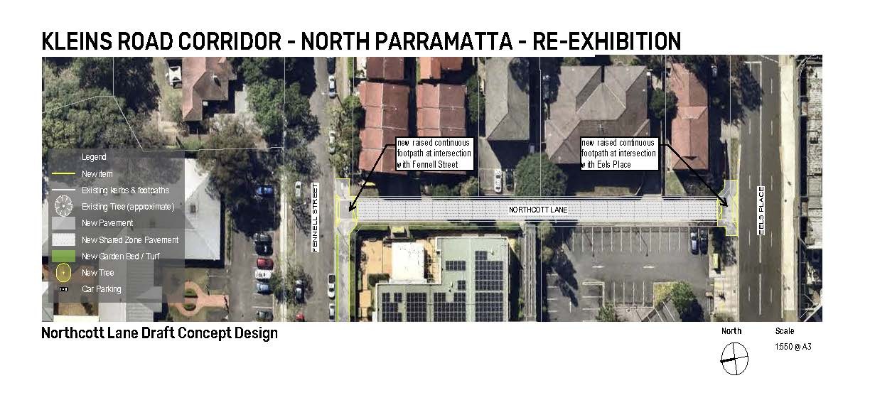 - A shared zone in Northcott Lane (Fennel Street to Eels Place).