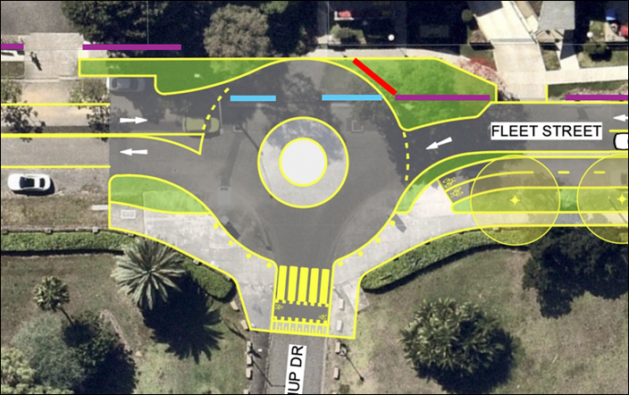 - A raised pedestrian and cyclist crossing of Greenup Drive at Fleet Street.