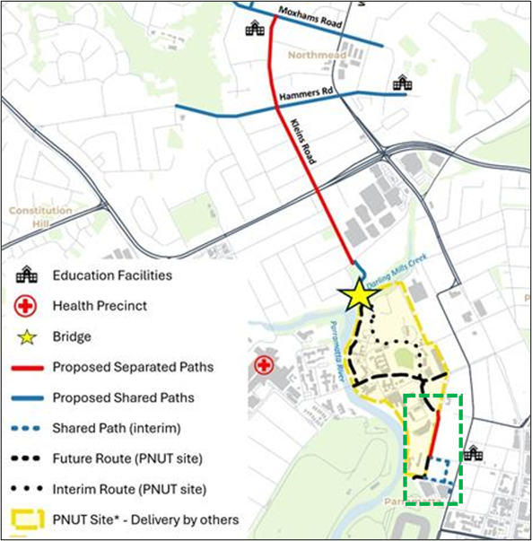 Kleins Road Pedestrian and Cyclist Corridor Stage 2 forms part of a regional cycling and walking route from Northmead and will provide a safe and enjoyable link to schools, shops and onto Parramatta Park, river foreshore paths and the CBD. (The Stage 2 area is highlighted on the map in dashed GREEN.)