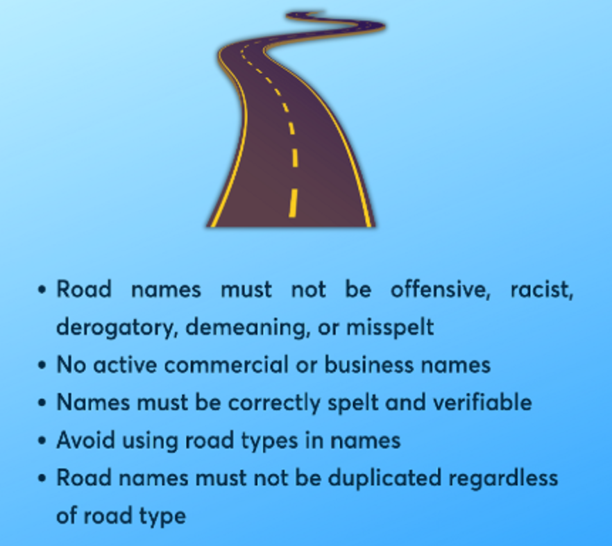 - Should include an appropriate road type suffix e.g. road, street, avenue