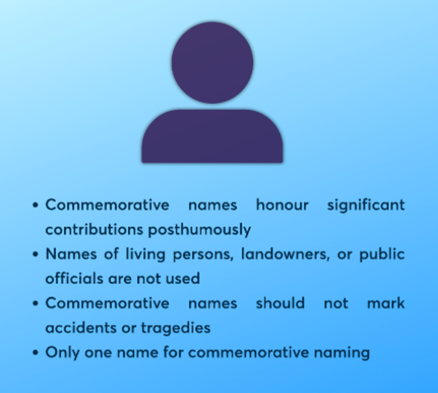 - If naming after a person, the person cannot be living and first names are to be avoided