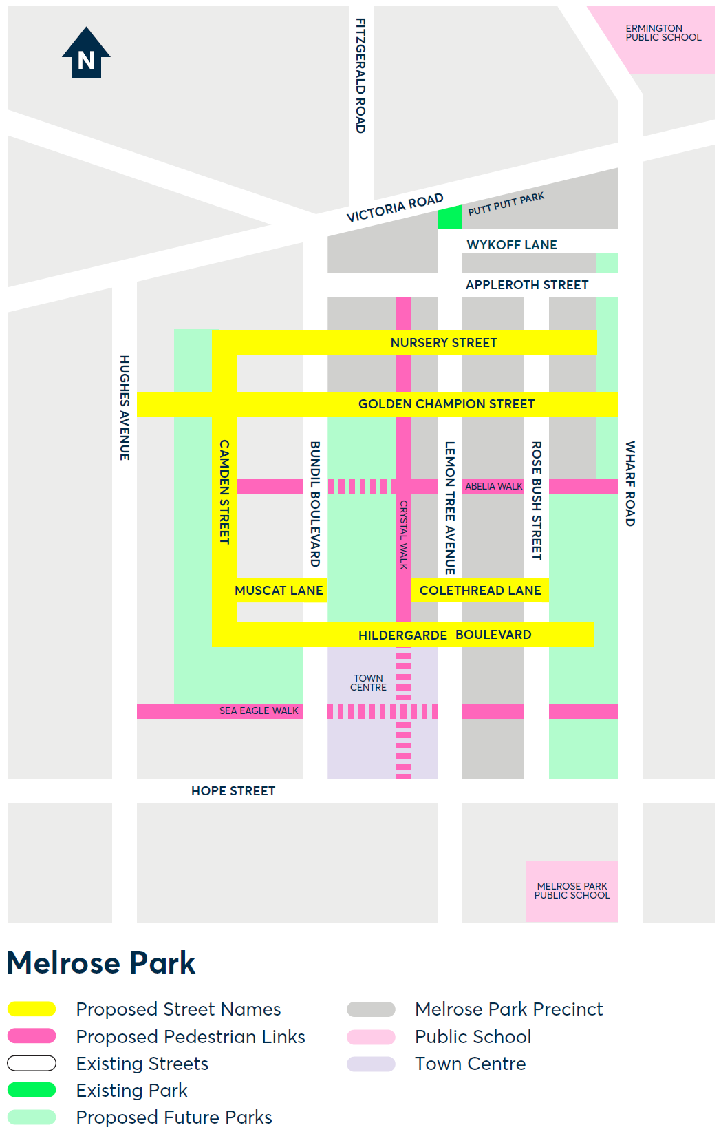 The newly subdivided Melrose Park Precinct is located to the north of Parramatta River and south of Victoria Road; it is also bordered by Ryde to the east and Ermington to the west. Covering approximately 30 hectares, when completed, the Melrose Park Precinct will include around 6,000 apartments, a new town centre, community amenities and around 5 hectares of public green open spaces and parklands.