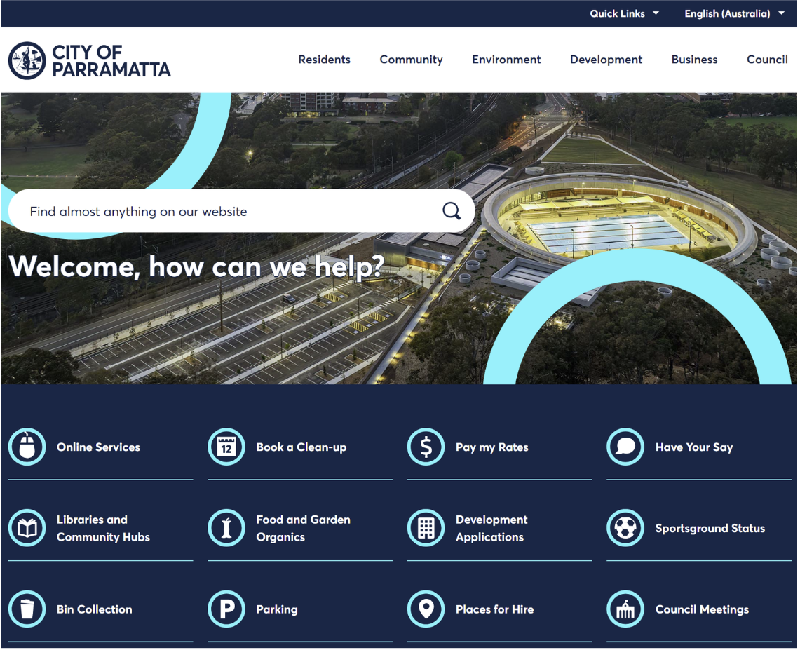 The City of Parramatta Council website is Council’s main information and services site. It is used for accessing information about existing services and business‑as‑usual matters, such as waste collection bookings, reporting potholes, parking enquiries, development applications (DAs), upcoming events and general Council information.