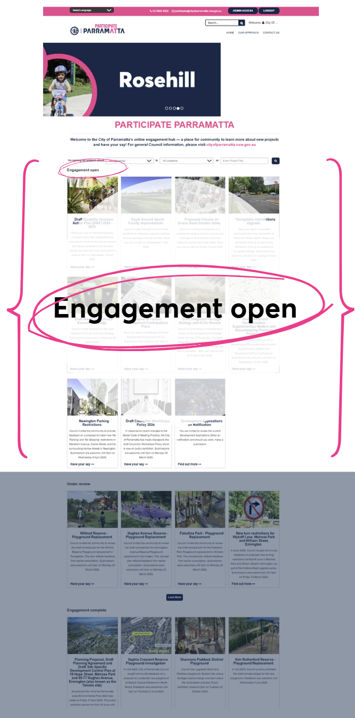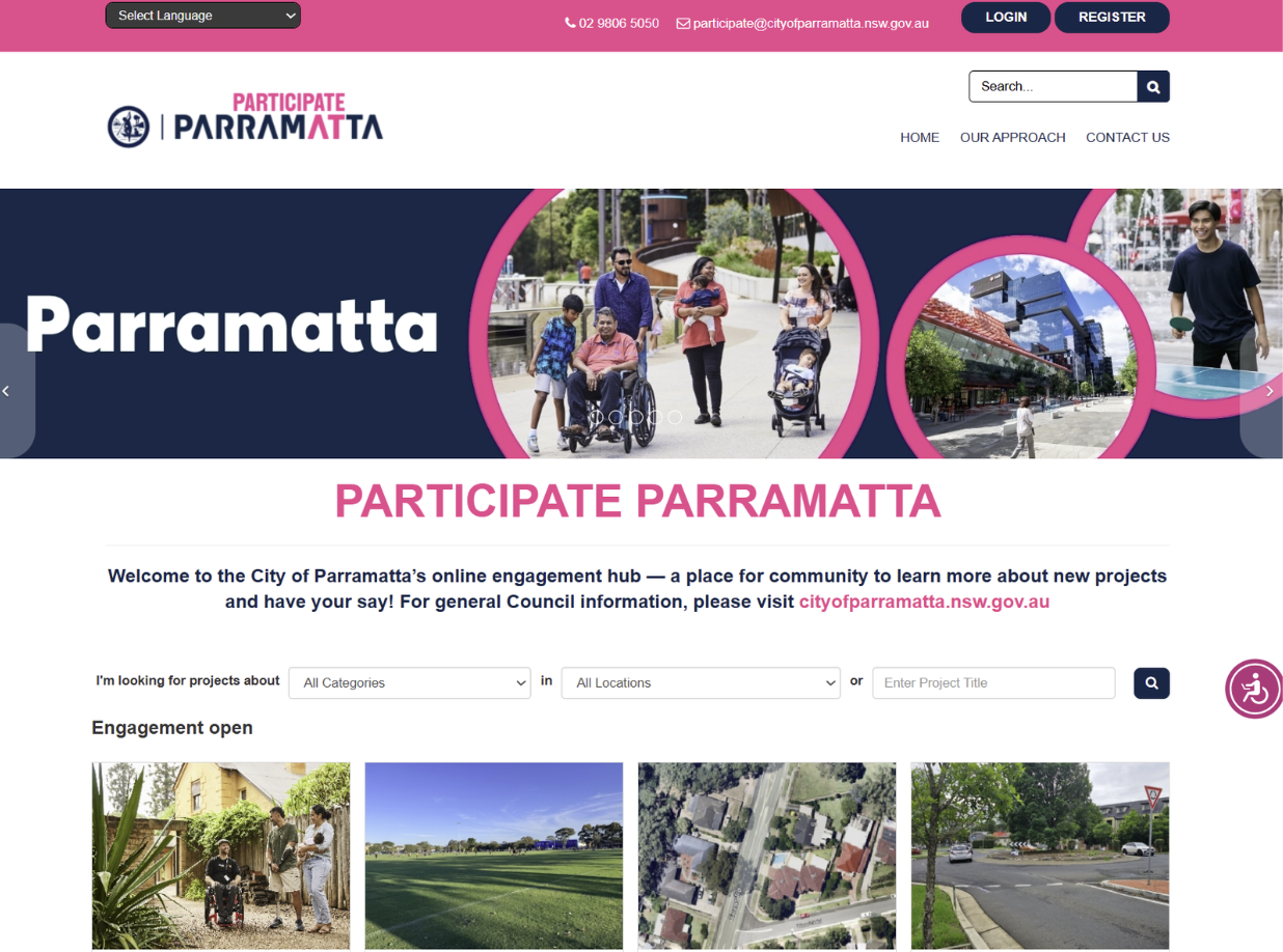 Participate Parramatta is designed to collect community feedback on projects at key stages where public input is needed to inform Council decisions (these are listed under the Engagement open section).