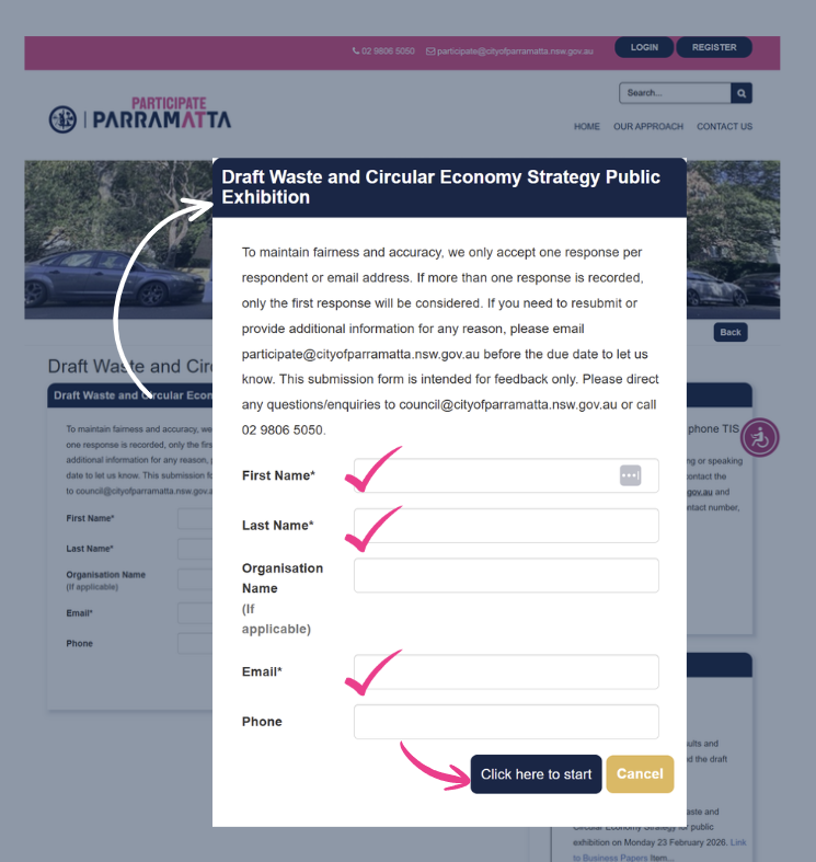 - Send in hardcopy mail to Council at PO Box 32, Parramatta NSW 2124 with the project subject line specified on the project page, and ensure you clearly state your full name, contact details and address.