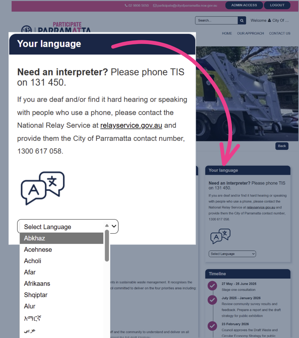 Participate Parramatta is equipped with an automatic translation function - simply go to the 'Your Language' widget on the top right-hand corner and select the relevant language. You can also use the free telephone translation service by calling 131 450.