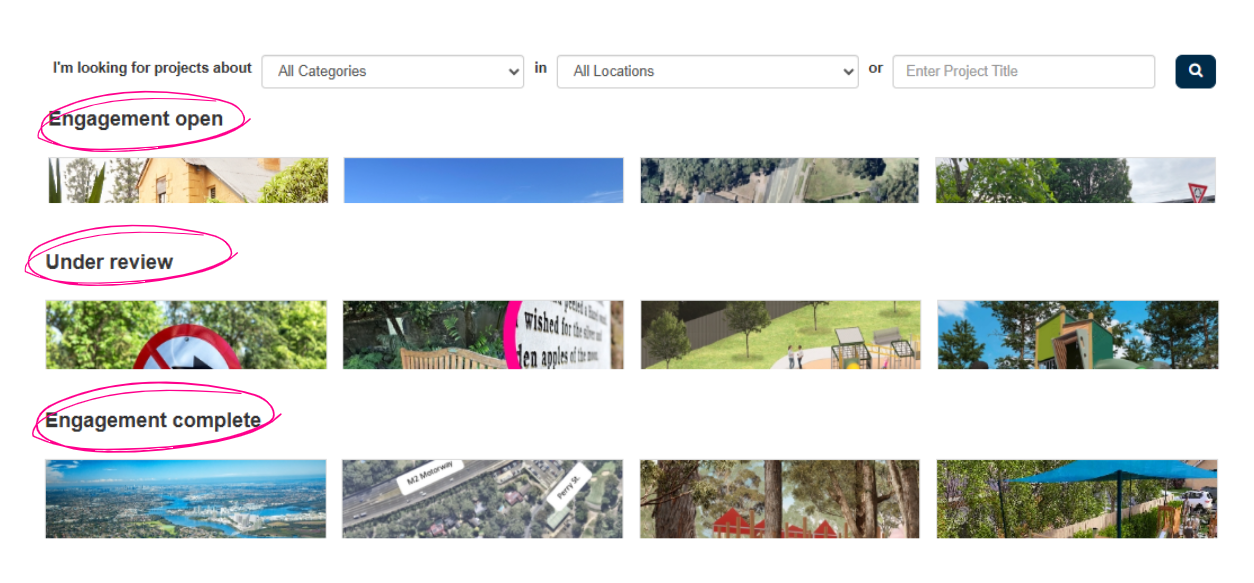Participate Parramatta는 의회의 결정에 필요한 공공 의견을 반영할 수 있도록, 프로젝트의 핵심 단계에서 지역사회 피드백을 수집하도록 설계되었습니다(이러한 프로젝트는 참여 진행 중(Engagement open) 프로젝트로 표시됩니다).
