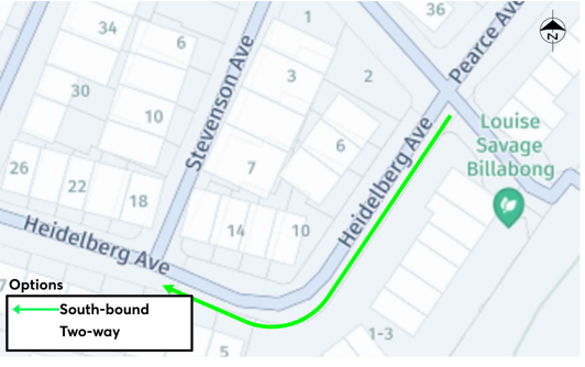 Due to the recently installed ‘No Parking’ restrictions, Council is only proposing a southbound one-way restriction for Heidelburg Avenue to ensure motorists can park on the left side of the street in line with the proposed traffic flow.