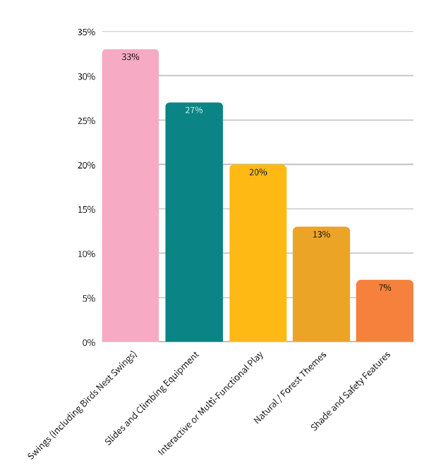2. There was a strong preference for interactive, versatile features in a natural environment, with soft fall surfaces for safety and cleanliness. Children preferred active play equipment, especially swings, slides, and climbing structures.