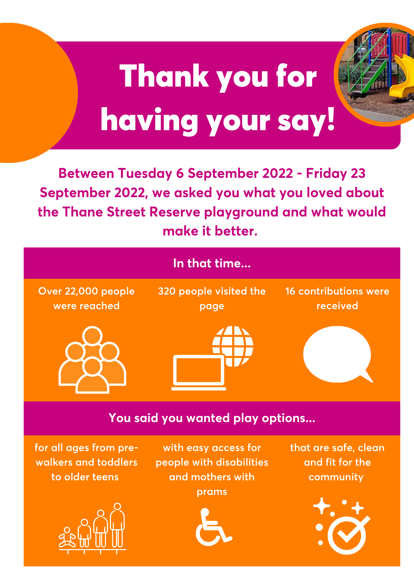In 2022 and 2023, we consulted with you to develop adraftdesign for thenew playground. Thank you to everyone that had their say.