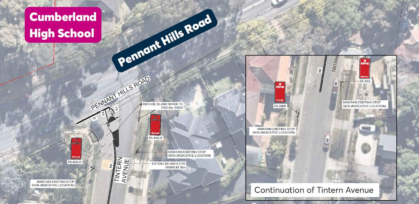 Located near Cumberland High School and the busy Pennant Hills Road, the upper section of Tintern Avenue has been identified as a hotspot for pedestrian activity involving both local residents and the school community. In line with the conditions of consent for the redevelopment of Carlingford West Public School and Cumberland High School, School Infrastructure NSW (SINSW) is proposing the construction of a pedestrian refuge island on Tintern Avenue, Carlingford, just south of Pennant Hills Road, as shown in the plan below. This proposal aims to enhance pedestrian safety and improve access to nearby schools. The proposed works will not affect existing on‑street parking or property access.
