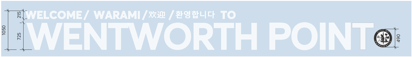 The proposed gateway sign includes the word for ‘Welcome’ in multiple languages. English, Korean and Chinese are the top three languages spoken in Wentworth Point. Dharug is the language spoken by the Traditional Owners of this land.