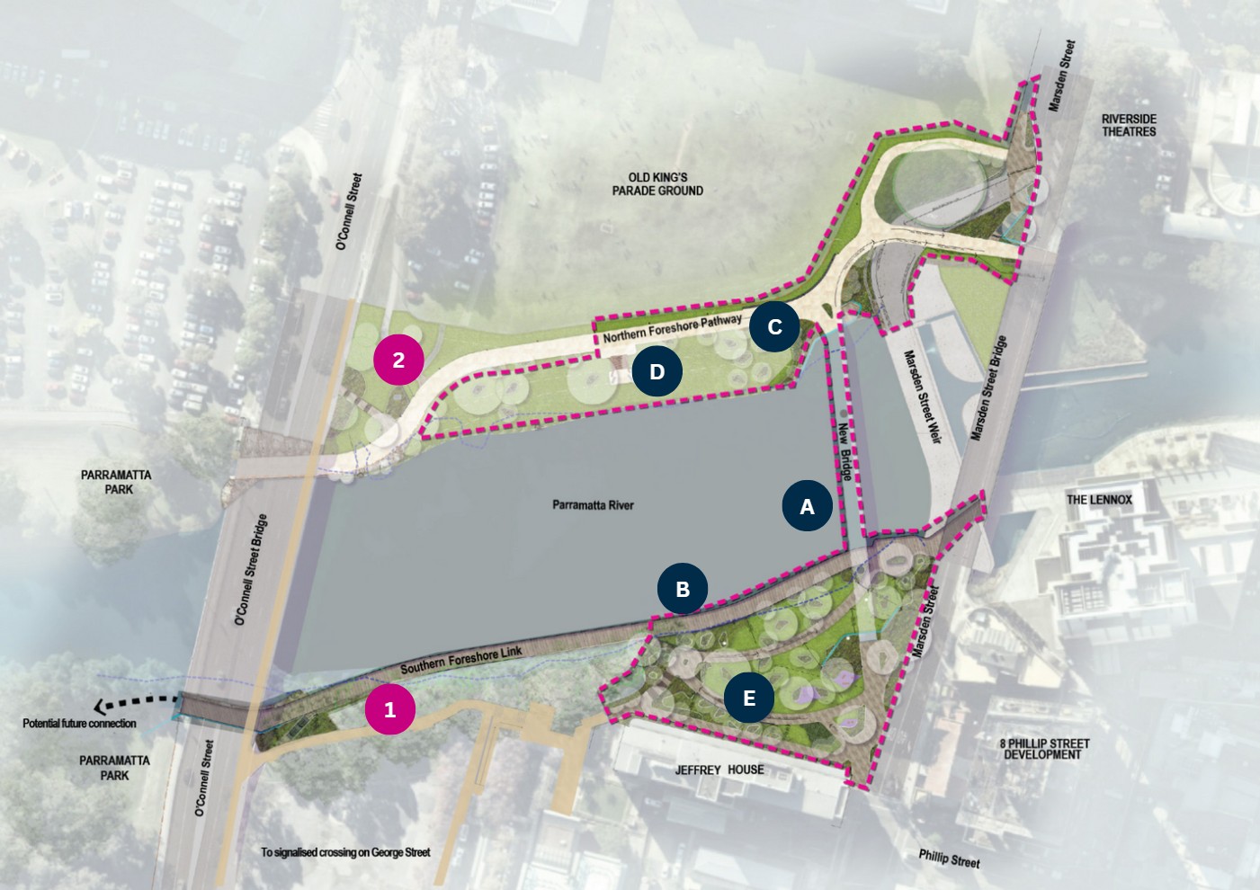 Improved Street-to-Foreshore Access: new ramps and stairs will better connect Marsden Street to the southern and northern foreshore, enhancing movement and interchange with the Parramatta River Valley corridor.